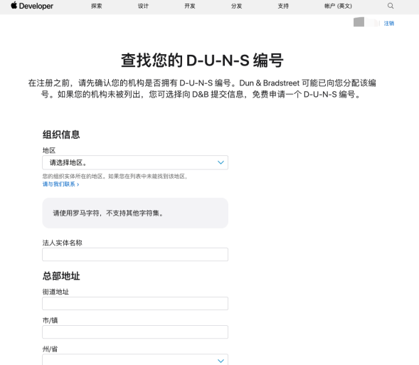 第三步:选择组织开发者进行注册,填写法人实体和邓白氏码(上一步已申请),建议复制邮件里的公司名字和编码